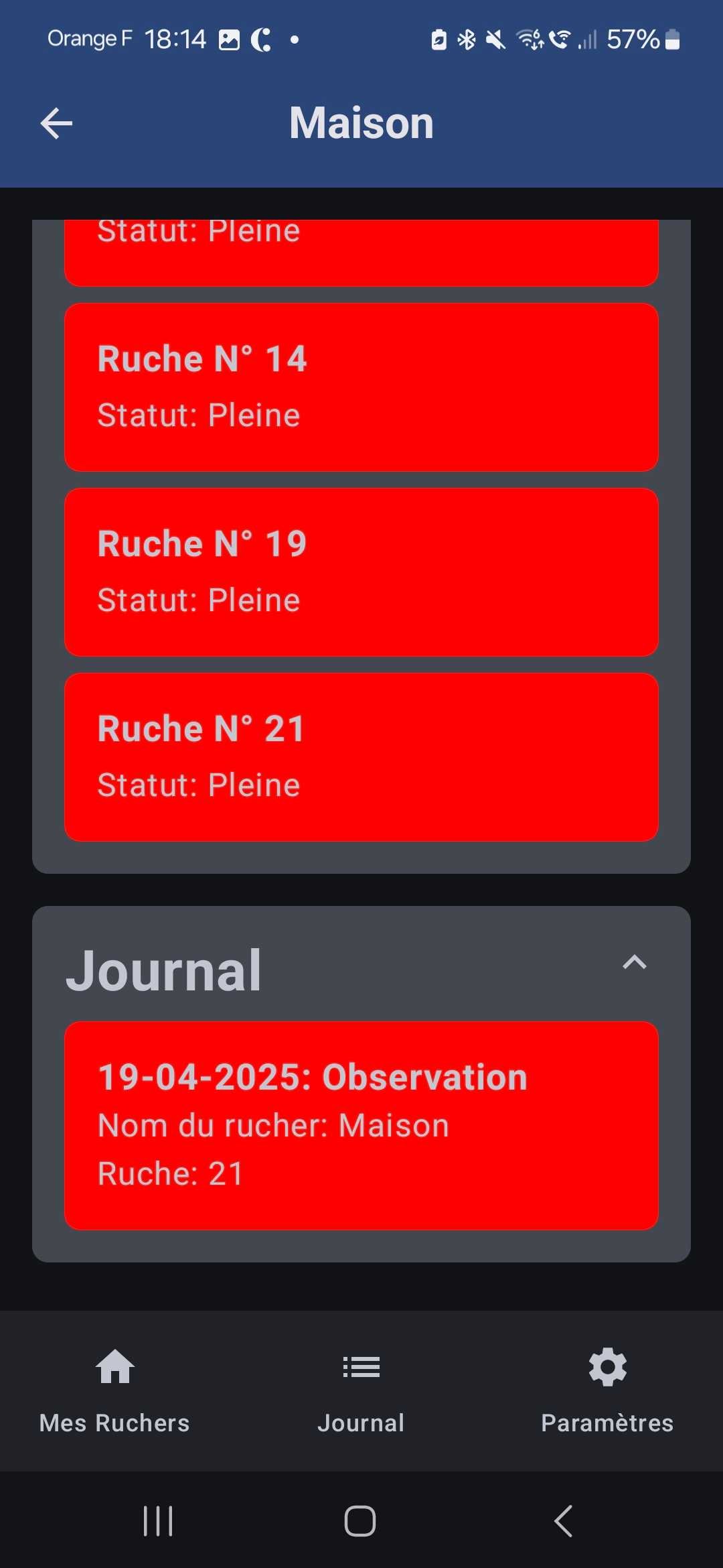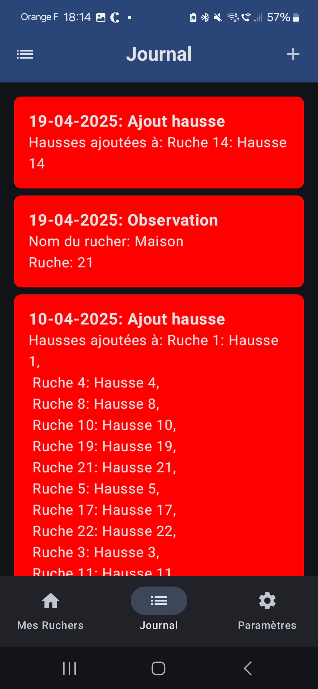 L’application s’ouvre sur une page récapitulative de mes ruchers, chacun présenté sous forme de fiches regroupant les informations essentielles : nom, nombre de ruches, dernière visite, etc. Une seconde page liste l’ensemble des événements enregistrés – qu’il s’agisse de récoltes, de transhumances ou de la perte d'une ruche – pour offrir une vision claire et chronologique des actions passées.